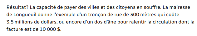 Dans une entrevue accordée à Patrice Roy, la mairesse de Longueuil nous apprend qu’un tronçon de rue de 300 mètres coûte aux contribuables 3,5 millions $: