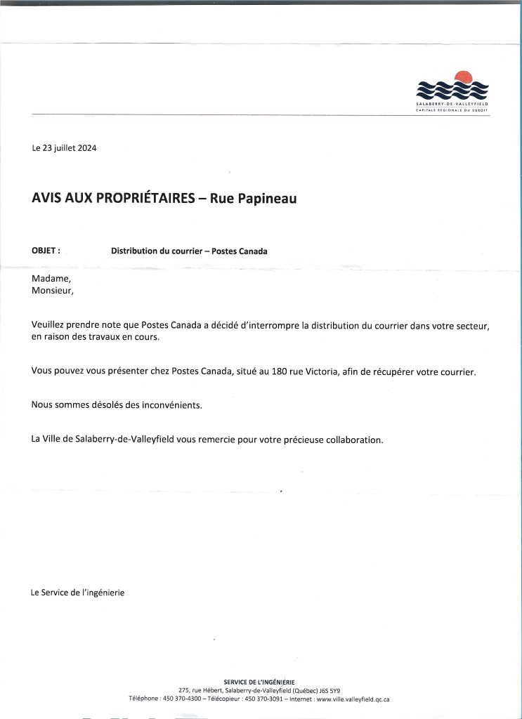 Le ou vers le 23 juillet 2024, un employé de la Ville (je présume) a distribué un AVIS AUX PROPRIÉTAIRES – Rue Papineau – que nous devions récupérer notre courrier au 180 rue Victoria.